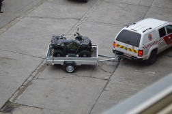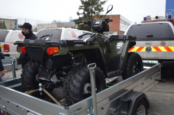 A terepmintázatú gumiabroncsokkal ellátott terepjáró jármű az önkéntes polgári védelmi szervezetek többcélú beavatkozó eszköze. A jármű kialakítása, technikai paraméterei szélsőséges időjárási és terepviszonyok között is lehetővé teszik a kárhelyszínek megközelítését, alkalmasak arra, hogy a beavatkozó állományt és a védekezéshez szükséges eszközöket a kárhelyszínre szállítsák vele, továbbá képes utánfutó vontatására. A járművön és az utánfutón lévő anyagok és eszközök biztonságosan rögzíthetőek, a quadok képesek szélsőséges terepviszonyok között, kevésbé teherbíró talajon, valamint meredek emelkedőkön is közlekedni. A vonóerőtől kezdve a kapaszkodóképességen át az üzembiztonságig a jármű minden tulajdonsága azt a célt szolgálja, hogy a gépjárművezető és a felszerelések biztonságosan megérkezzenek a bevetés helyszínére, majd a beavatkozás végeztével onnan az állomáshelyükre. A járművet a kövek, ágak okozta sérülések elleni védelem érdekében gallytörő ráccsal és védőlemezekkel látták el. A quadok és az utánfutók együttes értéke megközelíti a kétszázmillió forintot.