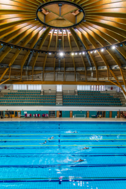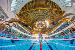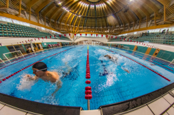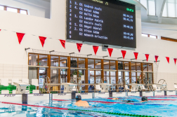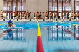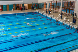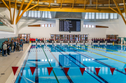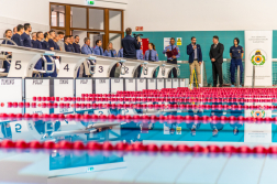 A köszöntőket követően a százméteres férfi gyorsúszással kezdetét vette a verseny. Amíg az ötven méteres medencében tíz pályán úsztak a versenyzők, addig a csapat többi tagja szurkolt, vagy a következő futamra melegített.