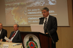 Az általános megnyitó rész után a vörösiszap természeti környezetre gyakorolt hatását tárgyalták az előadók. Sorukat prof. dr. Szépvölgyi János, a házigazda Természettudományi Kutatóközpont Anyag- és Környezetkémiai Intézetének főigazgató-helyettese nyitotta, aki magát a vörösiszapot mutatta be, szólt az anyag tárolásáról és hasznosításának lehetséges módjairól. Elhangzott, a vörösiszap a bauxit-feldolgozás mellékterméke, erősen lúgos oldat, amely alapvetően a kémhatása miatt jelenthet veszélyt. Az akadémikus elmondta, körülbelül a nyolcvanas évekig a vörösiszap lerakásának leginkább két módját használták: vagy a tengerbe öntötték, vagy a nedves lerakást alkalmazták. Utóbbi nagy környezeti kockázatot jelent, az iszap ebben az esetben 12-13-as pH-értékű, szilárdanyag-tartalma nagyjából harminc százalékos. A modern, viszont drága gépeket alkalmazó száraz technológia az anyag pH-ját 9-10-es szintre viszi le és a szilárdanyag-tartalom meghaladja a hatvanöt százalékot. Erre a technológiára 2011 februárjában álltak át Ajkán. 2013-ban a timföldgyártás le is állt az üzemben, azóta nem termelődik vörösiszap. Szépvölgyi János szólt arról, hogyan lehetne hasznosítani a vörösiszapot, annak vas-, alumínium-, titán-, nátrium-tartalmát, illetve a benne lévő ritkafémeket.