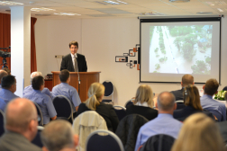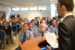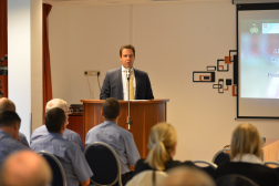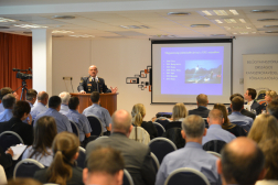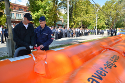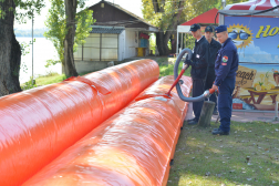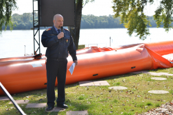 Az esemény zárásaként a konferencia vendégei a gyakorlatban is megtekinthették a mobilgát működését, miközben Simon Máté tűzoltó őrnagy, a BM OKF Gazdasági Ellátó Központjának raktározási alosztályvezetője részletesen ismertette a gát tulajdonságait és bemutatta annak használatát.