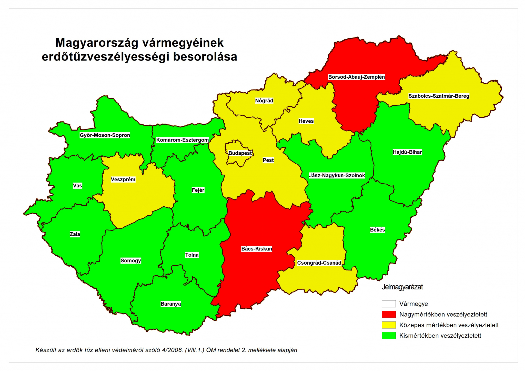 A vármegyék erdőtűz-veszélyeztetettségi besorolása az erdők tűz elleni védelméről szóló 4/2008. (VIII.1.) ÖM rendelet 2. mellékletében meghatározott szempontok alapján a következő: